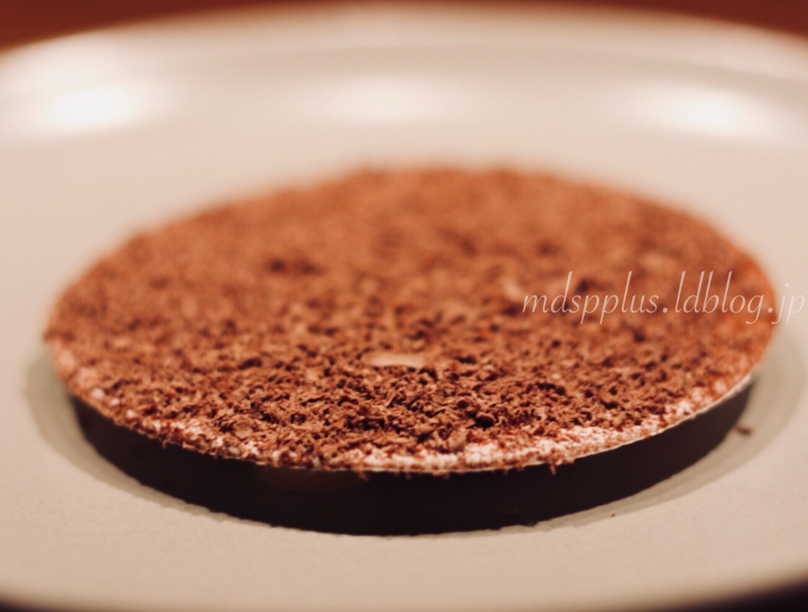 チョコのクリーム、レモンと洋梨のピューレ、メレンゲの上にチョコを削ったもの。