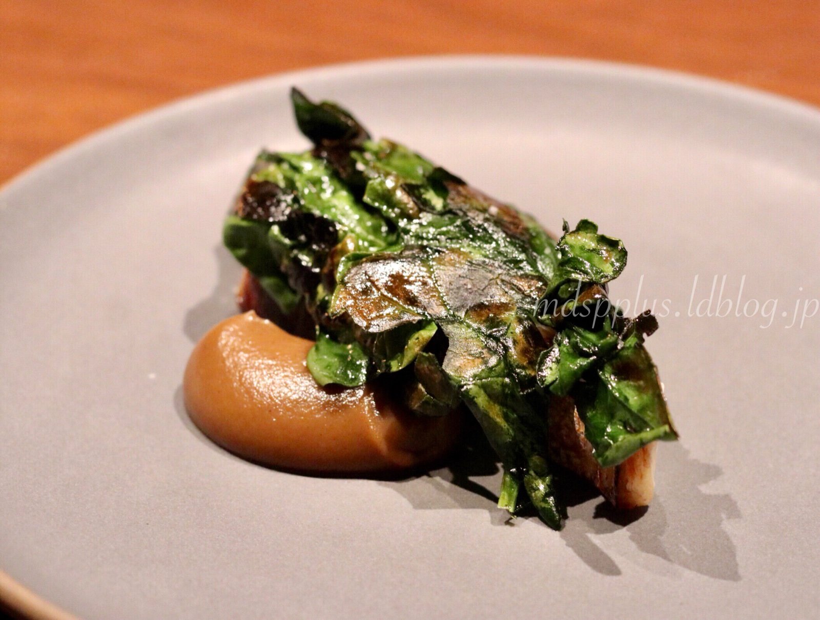 乾燥させたちぢみほうれん草をかぶせるスタイルは、北欧で食べた料理を思い起こさせる。