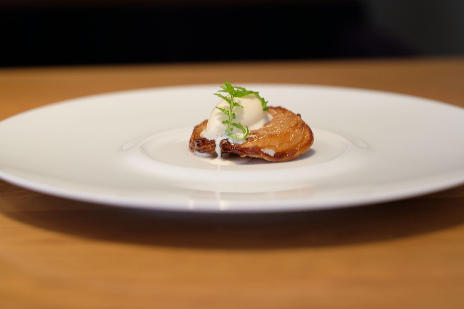 マリネした新玉ねぎのロースト、さくさくのパイ生地、フォアグラのパウダー、アスパラのアイス。